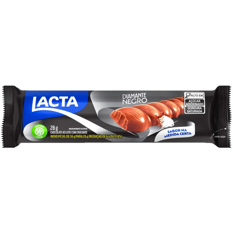 Tablete de chocolate Diamante Negro. O inconfundível e icônico tablete da Lacta que une o sabor do cacau com pedacinhos crocantes de açúcar e castanha. A barra de 28g tem o tamanho ideal para quando bater aquela vontade de doce, é sabor na medida certa. Display contendo 12 unidades.