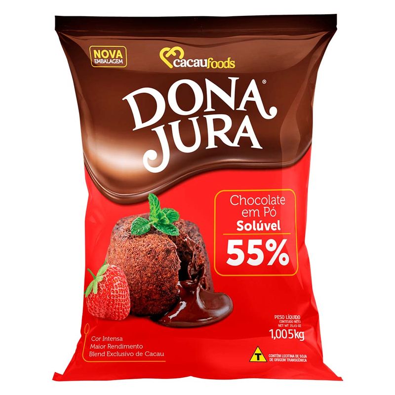 Chocolate em pó 55% cacau solúvel ideal para uso culinário. O Chocolate em pó Dona Jura, é reconhecido como o mais saboroso e rentável da categoria, produto solúvel, sabor marcante de cacau, produzido com os melhores tipos de cacaus do mundo, cor incomparável, excelente resultado quando levado ao forno. Os “Chocolates em pó – Dona jura” são muito utilizados para doces, bolos, tortas, bebidas, recheios e coberturas. Embalagem de 1,005kg.