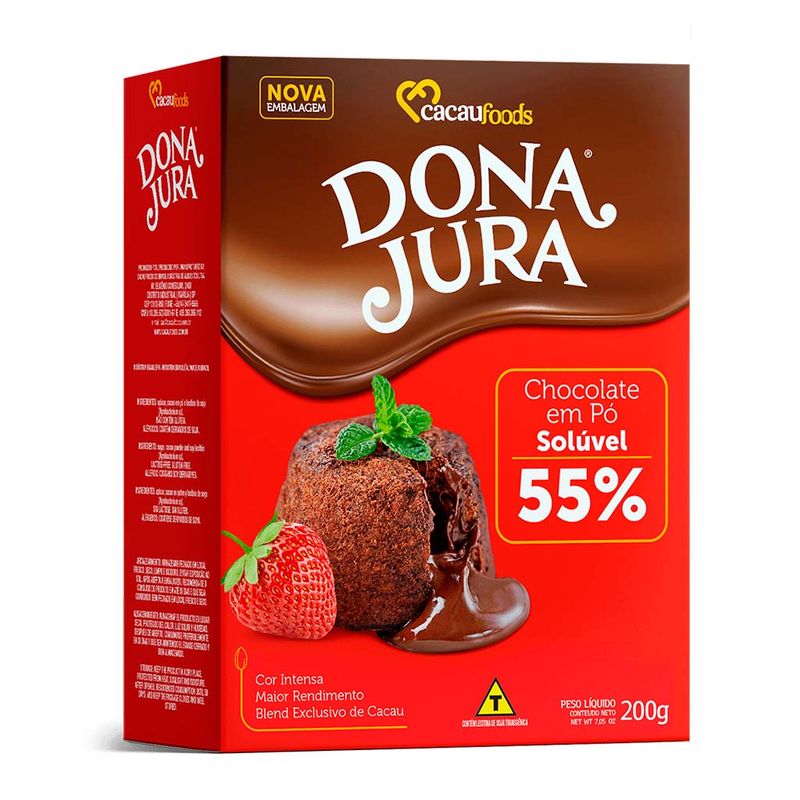 Chocolate em pó 55% cacau solúvel ideal para uso culinário. O Chocolate em pó Dona Jura, é reconhecido como o mais saboroso e rentável da categoria, produto solúvel, sabor marcante de cacau, produzido com os melhores tipos de cacaus do mundo, cor incomparável, excelente resultado quando levado ao forno. Os “Chocolates em pó – Dona jura” são muito utilizados para doces, bolos, tortas, bebidas, recheios e coberturas. Embalagem de 200g. Sem Lactose, Cor intensa, maior rendimento, blend exclusivo de cacau.