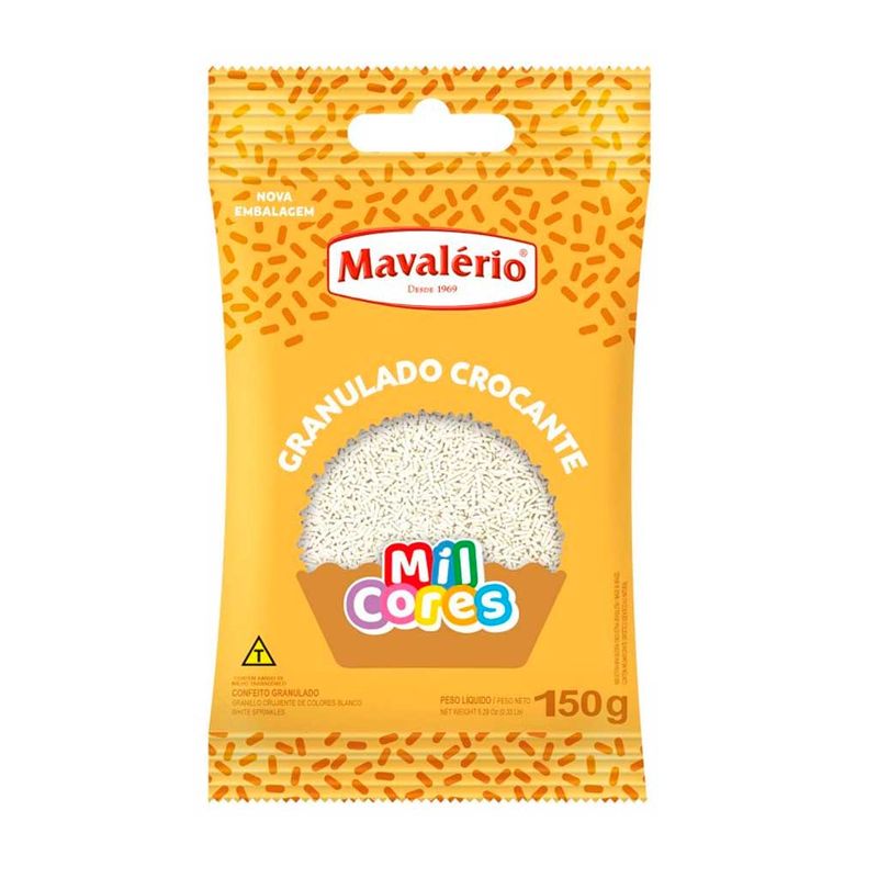 Granulado crocante na cor branca. Para uso na decoração de brigadeiros, docinhos, bolos, tortas, pães, mousses, verrines, pães de mel, cupcakes, churros e pizzas. Ideal para uso em massas de bolo, cookies, biscoitos, pães, cupcakes, muffins. Produto forneável.