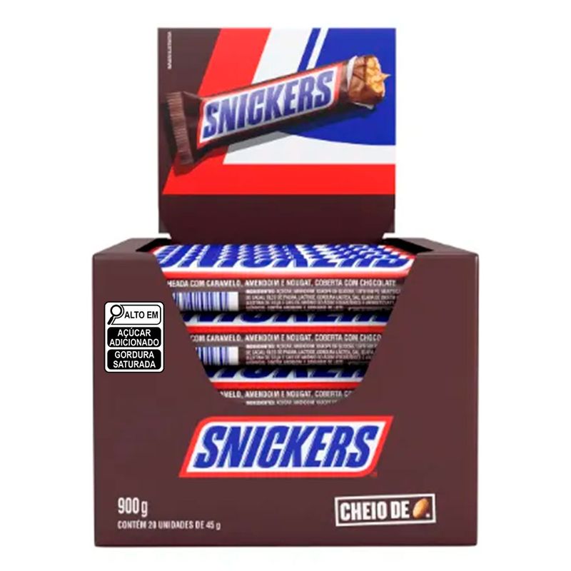 SNICKERS é uma generosa barra de chocolate ao leite, amendoim e caramelo que mata sua fome! Contém 20 unidades de 45g cada.