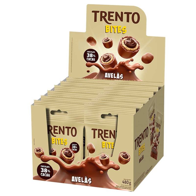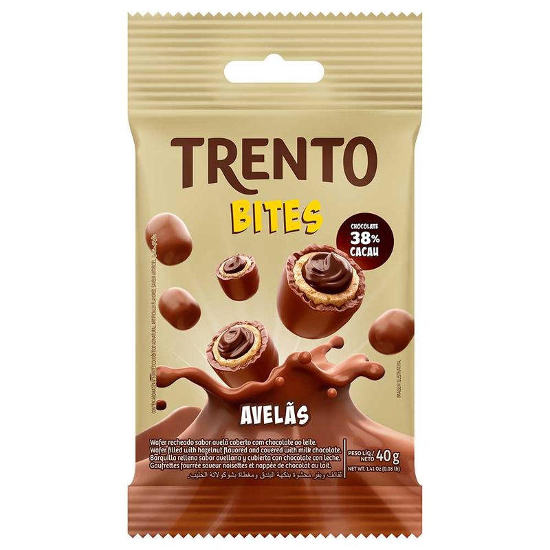 Trento Bites, wafer recheado sabor avelã coberto com chocolate ao leite 38% cacau.