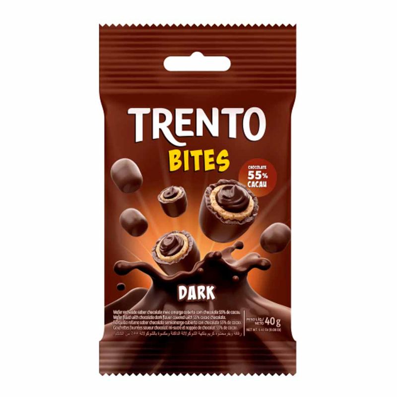 Wafer recheado sabor chocolate meio amargo coberto com chocolate dark 55% cacau.
