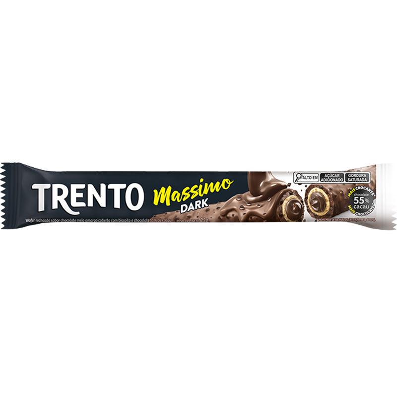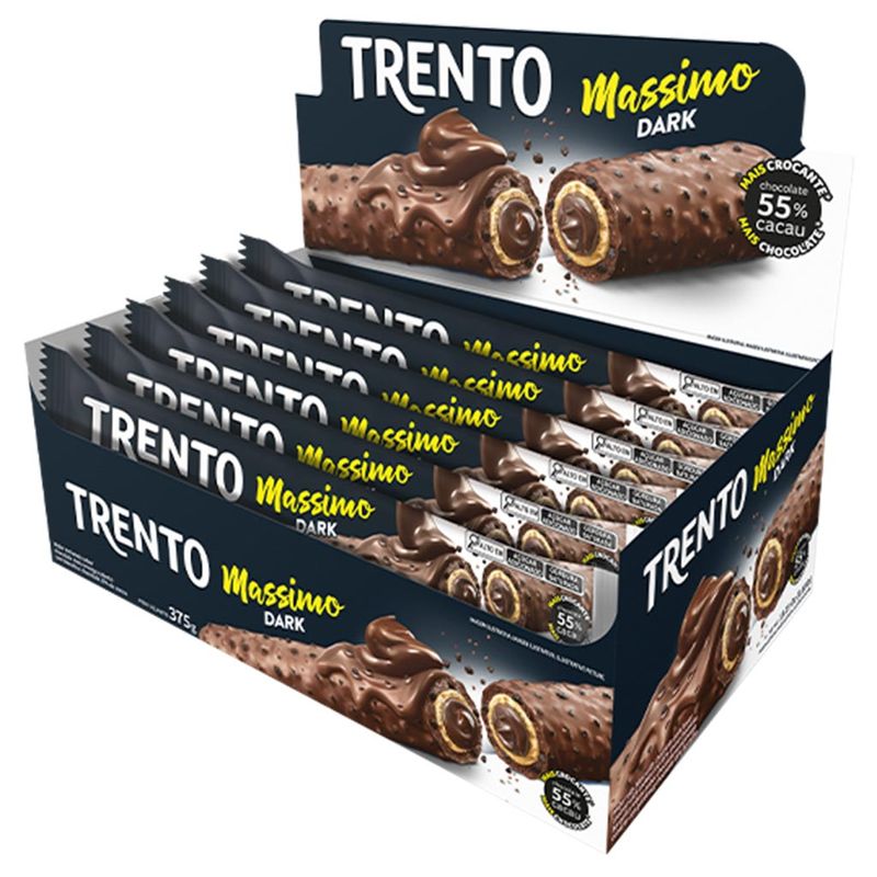 Trento Massimo Dark, um delicioso wafer recheado sabor chocolate meio amargo coberto com biscoito e chocolate 55% de cacau. Mais crocante, mais chocolate. Caixa contendo 15 unidades.