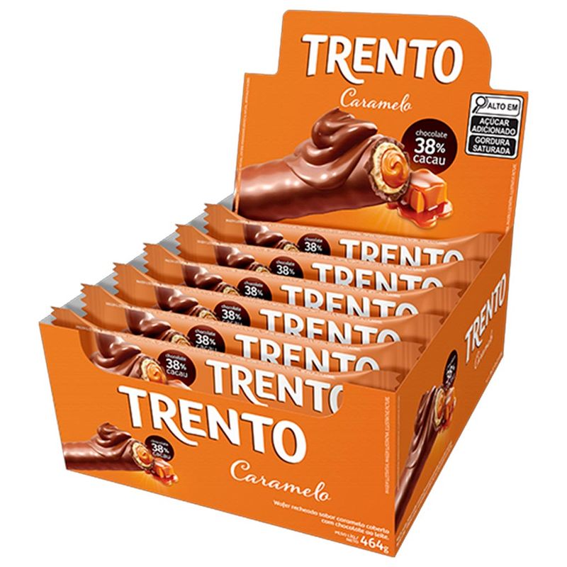 Trento chocolate, um wafer recheado com sabor caramelo e coberto com chocolate ao leite 38% de cacau. Crocante, cremoso e com sabor sem igual. Contém 16 embalagens com 2 unidades em cada caixa.
