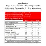 Ingredientes: polpa de coco parcialmente desengordurada, desidratada. Conservador INS 223. NÃO CONTÉM GLÚTEN.