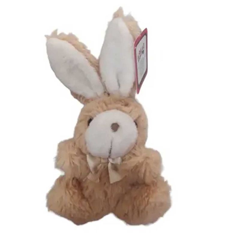Coelho Popy branco de pelúcia com tecido bege nas orelhas e laço bege no pescoço.Medidas: Aproximadamente 20 cm de altura por 13 cm de largura.