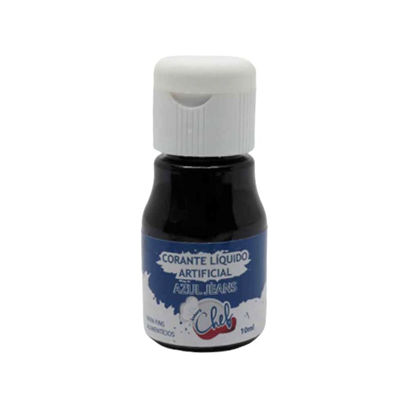 Corante Líquido Artificial Azul Jeans Chef, frasco com 10ml, para fins alimentícios. Ideal para trabalho em aerógrafo, aplicação em bebidas, balas, caldas, geléias, sorvetes e afins.