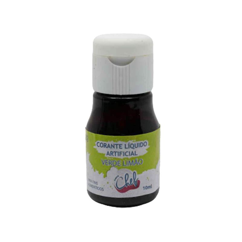 Corante Líquido Artificial Verde Limão Chef, frasco com 10ml, para fins alimentícios. Ideal para trabalho em aerógrafo, aplicação em bebidas, balas, caldas, geléias, sorvetes e afins.