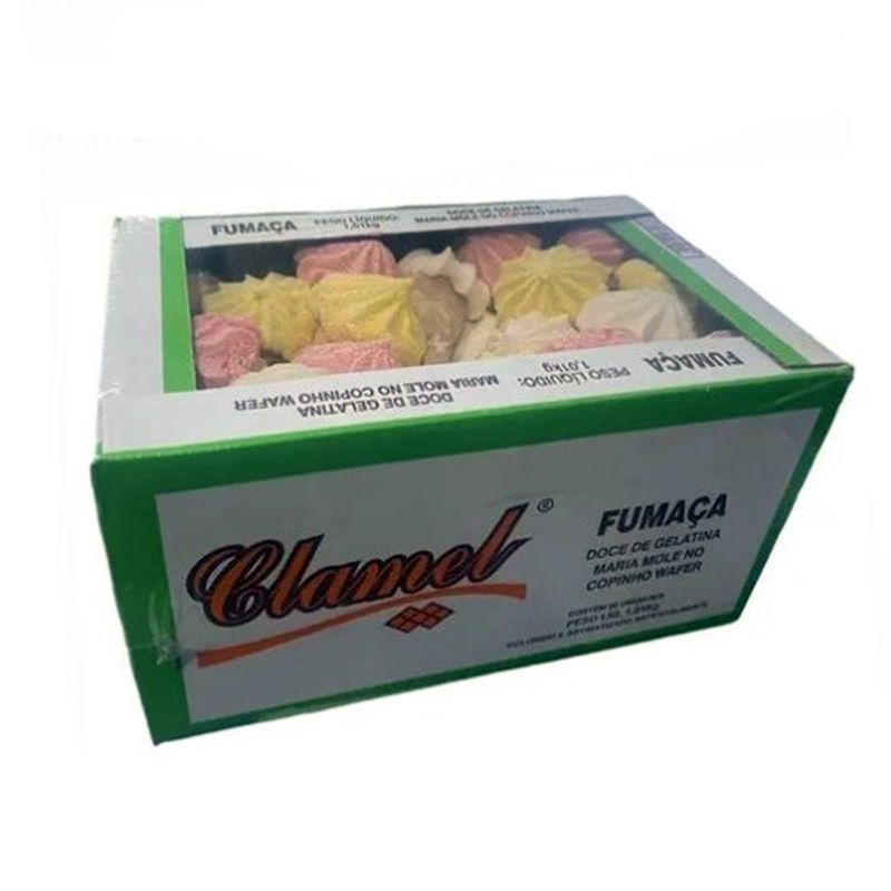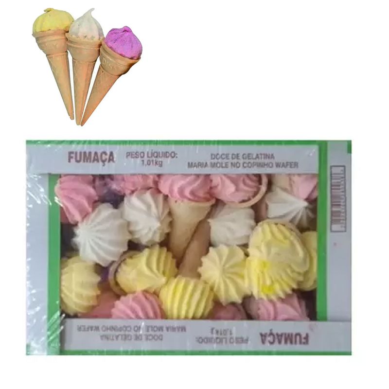 Fumaça e um doce de gelatina maria mole em diversas cores com confeito colorido que vem em um copinho de wafer.