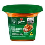 Ingredientes: soro de leite refrigerado e/ou soro de leite em pó reconstituído, açúcar, leite fluído à granel de uso industrial e/ou leite em pó integral reconstituído, amido modificado, água, coco ralado, concentrado de proteíco de soro em pó e sal. Estabilizante citrato de sódio (INS 331III), conservante sorbato de potássio (INS 202), corantes caramelo (INS 505C), caramelo (INS 150D), dióxido de titânio (INS 171), amarelo tartrazina (INS 10s) e vermelho allura ac (INS 129), aroma idêntico ao natural de leite, aroma idêntico ao natural de doce de leite e estabilizante bicarbonato de sódio (INS 500II). Alérgicos: contém leite e derivados e coco. Pode conter amendoim, avelã, castanha de caju e pistache. Contém lactose. Não contém glúten.