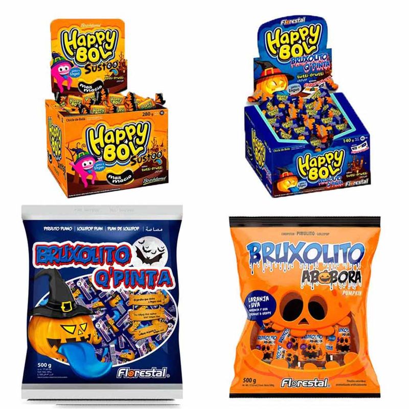 Doces Dia das Bruxas Halloween 1 Pirulito Abóbora e 1 Bruxolito, 1 Chicle Susto e 1 Pinta a Língua