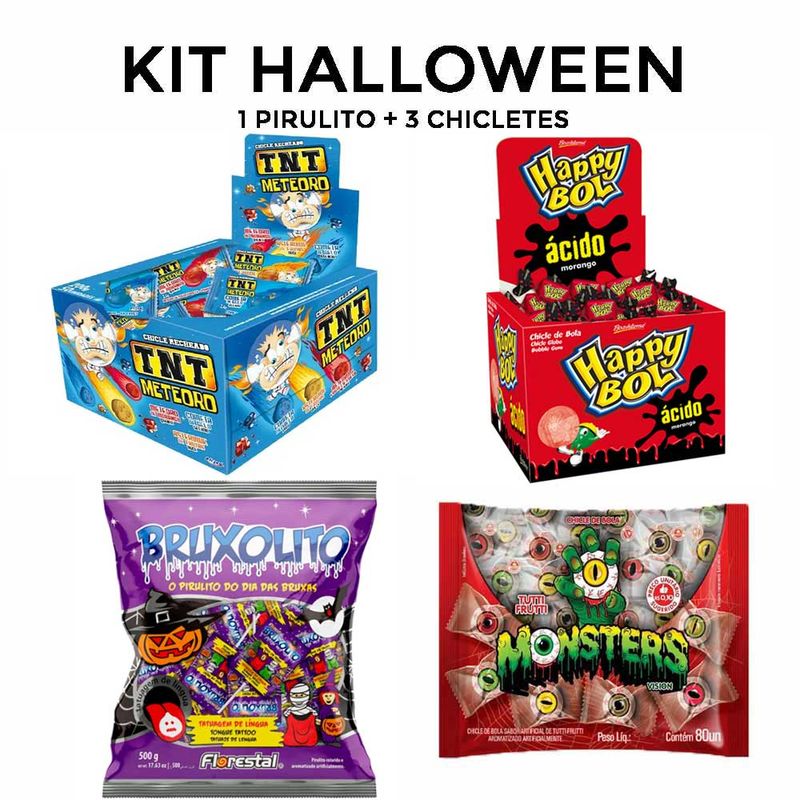 Kit Festa Halloween Dia das Bruxas 1 Chicle Cabeça Abóbora e 1 Baba de Bruxa, 1 Pirulito Bruxolito, 1 Chiclé Olho