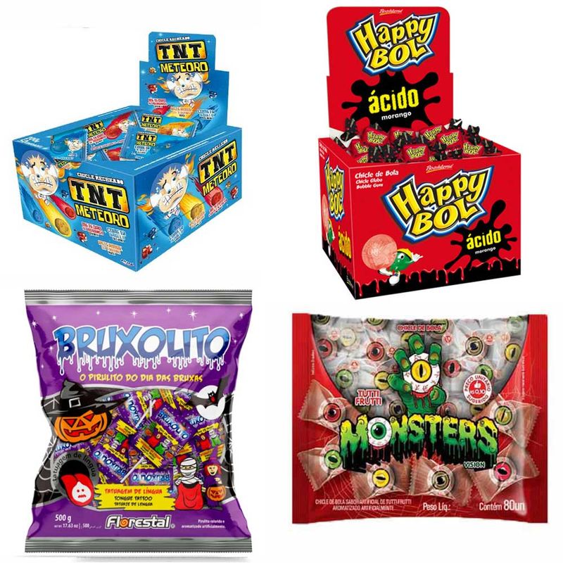 Doces Dia das Bruxas Halloween 3 Chiclés (Cabeça Abóbora+Olho+Baba de Bruxa) 1 Pirulito Bruxolito