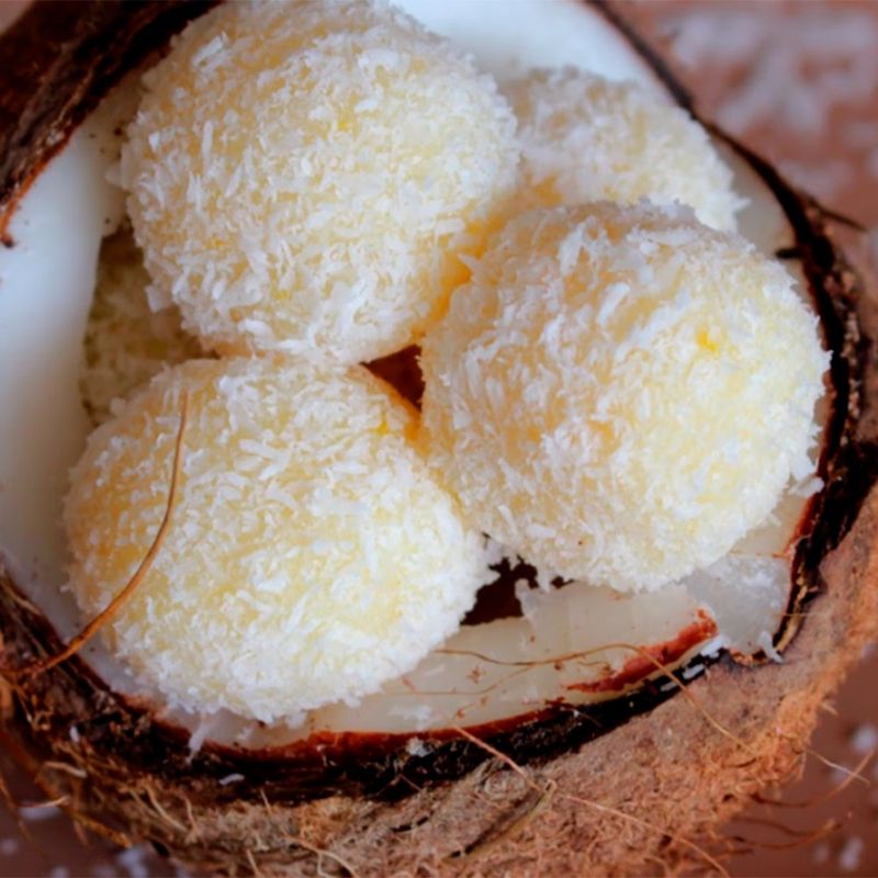 Docinho de Coco Primoly. Em porções pequenas e redondinhas, tem sabor de doce de coco caseiro. Você não vai conseguir comer um só! Embalagem contendo 50 unidades embaladas individualmente.