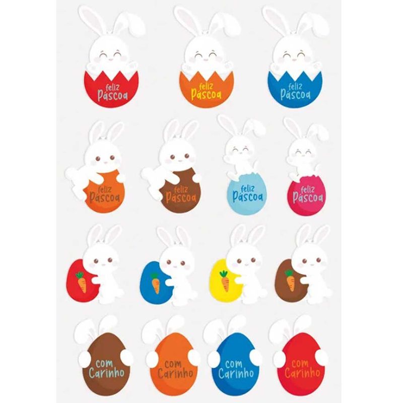 etiquetas adesivas coelhinho feliz páscoa! Contém 02 cartelas com 15 etiquetas. Composição: papel couche, adesivo e pigmento colorido.