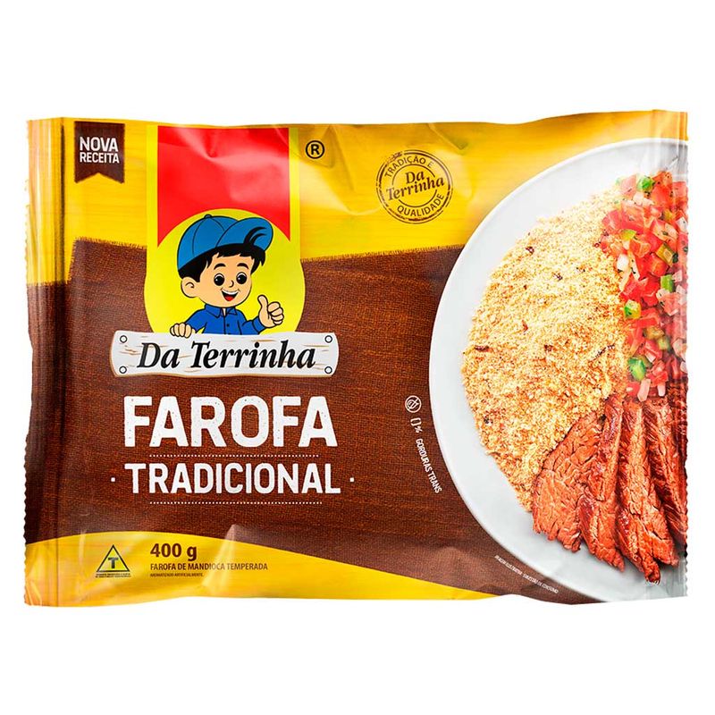 Farofa de mandioca pronta temperada Da Terrinha. Produzida com ingredientes e temperos selecionados para garantir um sabor delicioso e uma textura crocante.