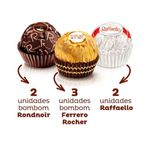 Contém 3 unidades de Ferrero Rocher, 2 unidades de Raffaello e 2 unidades de Rondnoir.