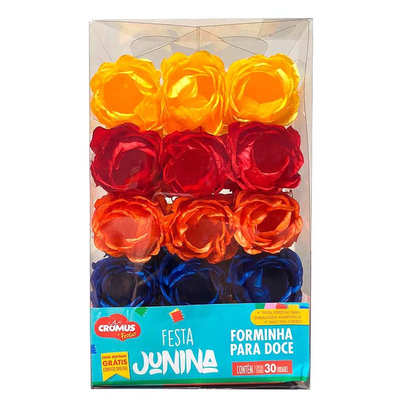 Forminha para doces em formato de flores ideal para completar a decoração de sua Festa Junina. Contém 30 unidades nas cores amarelo, vermelho, laranja e azul.