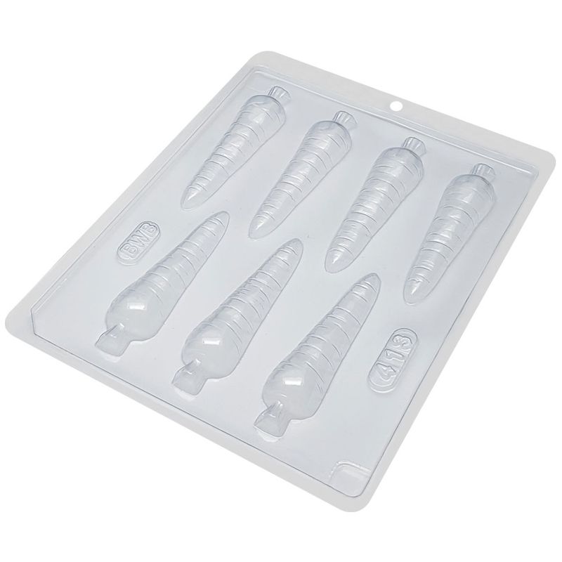 Forma de acetato com formato de cenoura ideal para o preparo chocolates de páscoa. Total de 7 cavidades. Medidas: Comprimento: 10cm x Diâmetro 2,5cm. Obs.: A forma não é de três partes, é apenas uma face de acetato.