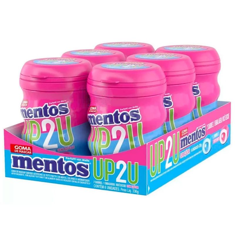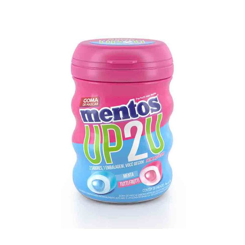 A goma de mascar Mentos tem sabor intenso, e é sem açúcar. UP2U tem dois sabores em uma embalagem, menta e tutti frutti, com uma casquinha crocante e recheado com um sabor intenso, você vai se surpreender com essa sensação de refrescância prolongada.No formato de maxi gomas, o pote vem com aproximadamente 28 unidades.