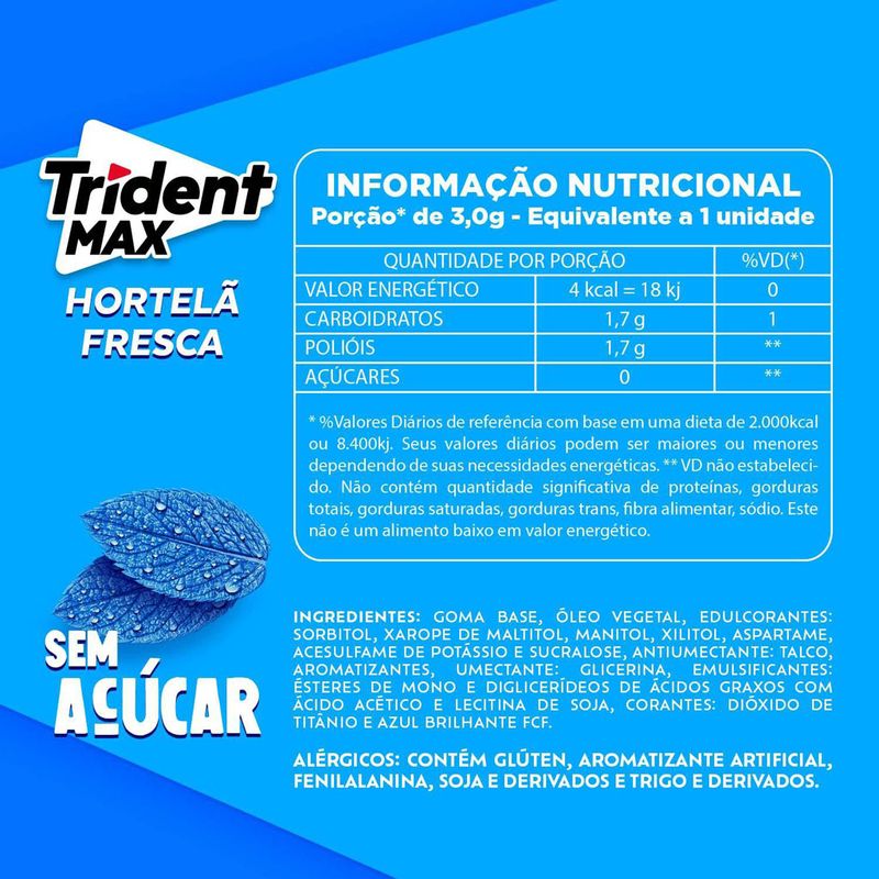 Ingredientes: Goma base, óleo vegetal, edulcorantes: sorbitol, xarope de maltitol, manitol, xilitol, aspartame, acesulfame de potássio e sucralose, antiumectante: talco, aromatizantes, umectante: glicerina, emulsificantes: ésteres de mono e diglicerídeos de ácidos graxos com ácido acético e lecitina de soja e corantes: dióxido de titânio e azul brilhante FCF. Alérgicos: Contém derivados de trigo e soja. Contém glúten. Contém fenilanina.