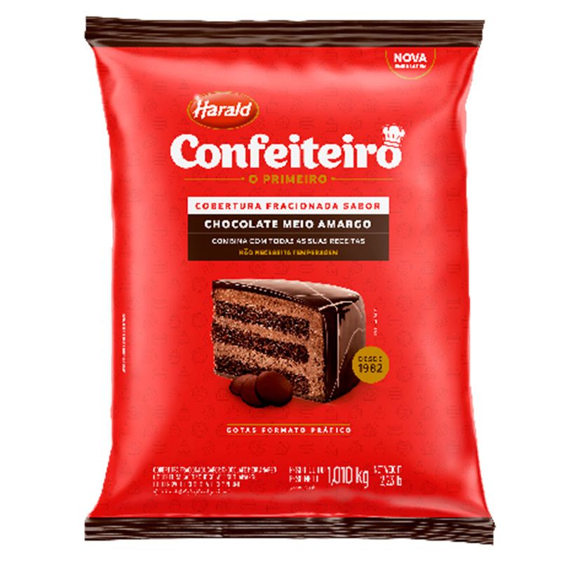 Cobertura fracionada sabor chocolate meio amargo. A linha Confeiteiro é uma mão na roda para banhar e cobrir sem precisar fazer a têmpera. Para rechear, finalizar e decorar com mais praticidade. A versão em gotas traz mais praticidade, pois não é preciso picar a cobertura para derretê-la.
