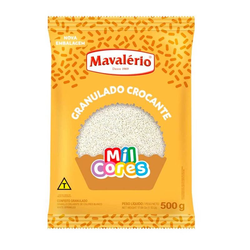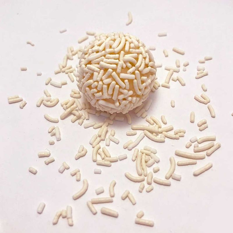 Granulado crocante na cor branca. Para uso na decoração de brigadeiros, docinhos, bolos, tortas, pães, mousses, verrines, pães de mel, cupcakes, churros e pizzas. Ideal para uso em massas de bolo, cookies, biscoitos, pães, cupcakes, muffins. Produto forneável.