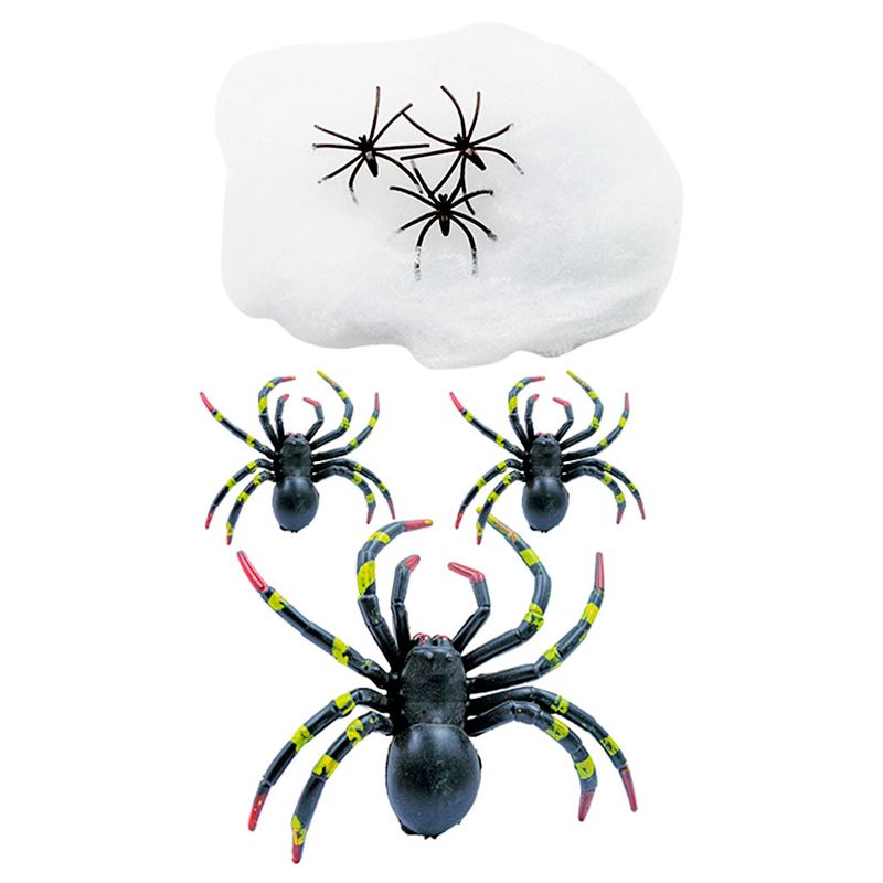 Kit de enfeites contendo aranhas e teia ideal para complementar a sua festa de Halloween. Use a criatividade e deixe a sua festa mais divertida!