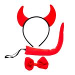Acessórios para fantasia de dia das bruxas contendo uma tiara de chifre, uma gravata e uma cauda. Use a criatividade e deixe a sua festa mais divertida!