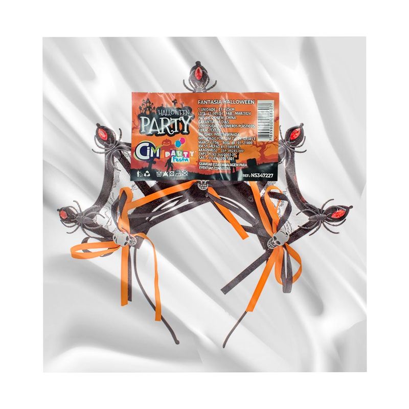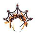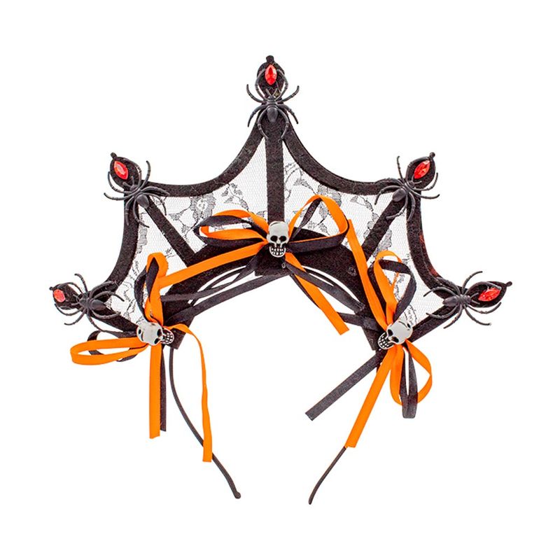 Tiara com tema de Halloween em formato de coroa com renda, caveiras e aranhas. Um acessório divertido e assustador para a sua fantasia de dia das bruxas.