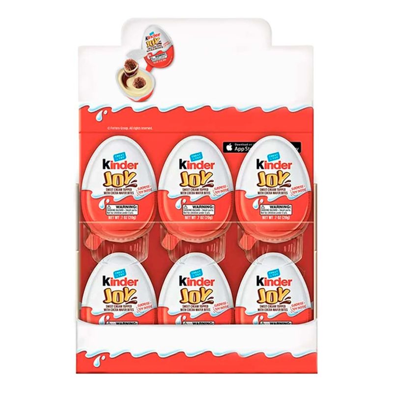 Kinder Joy, um lado cheio de sabor e o outro cheio de diversão! O delicioso ovinho com duas metades. De um lado creme de cacau e leite com dois bombons crocantes. Do outro, uma surpresa divertida. Abriu, puxou, colherou, brincou. Caixa com 16 unidades de Kinder Joy de 20g, brindes sortidos.