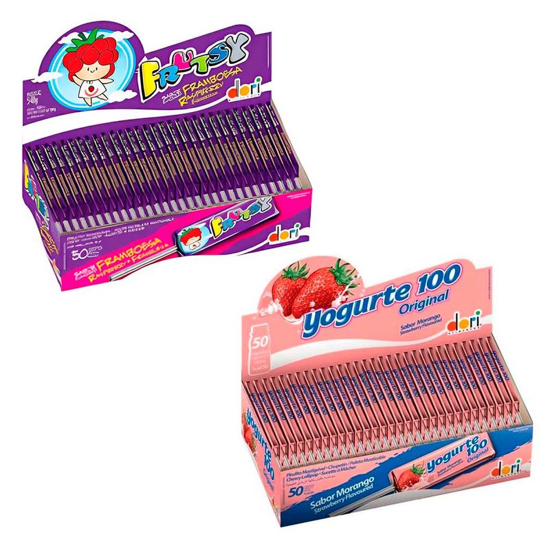 Kit contendo os pirulitos mastigáveis que são sucesso da Dori: Yogurte 100 e Frutsy Framboesa. Delicioso, macio e divertido! Contém 1 caixa de cada sabor, cada caixa contém 50 unidades.