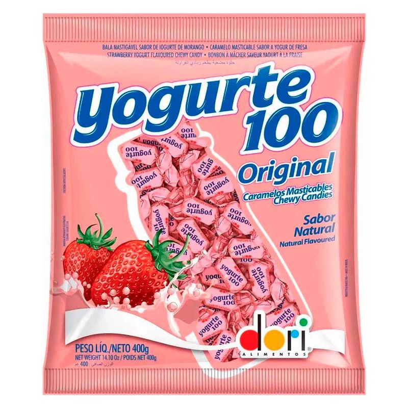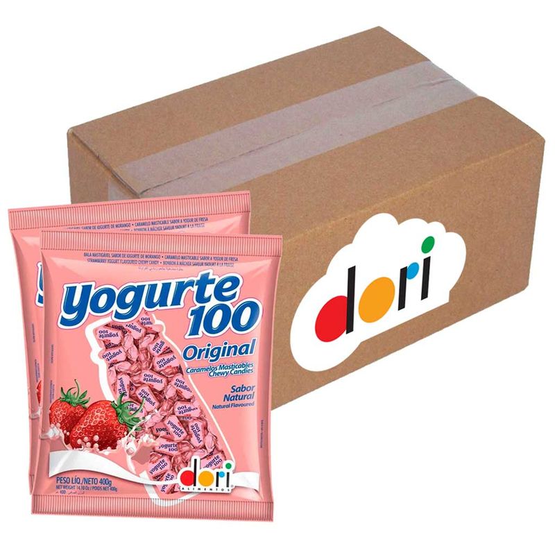 Tradicional e deliciosa bala mastigável com sabor de iogurte de morango. Kit contendo 24 pacotes de 400g cada.