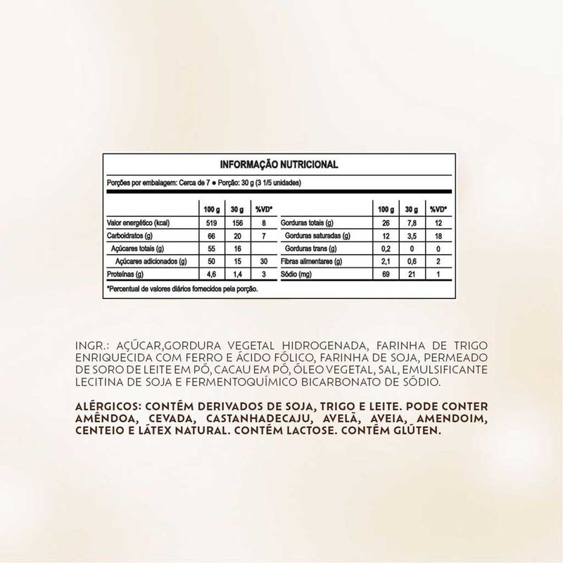 Ingredientes: Açúcar, gordura vegetal hidrogenada, farinha de trigo enriquecida com ferro e ácido fólico, farinha de soja, soro de leite em pó, cacau, óleo vegetal, sal, emulsificante lecitina de soja e fermento químico bicarbonato de sódio. ALÉRGICOS: CONTÉM DERIVADOS DE SOJA, DERIVADO DE TRIGO E DERIVADO DE LEITE. PODE CONTER AMÊNDOA, CEVADA, CASTANHA-DE-CAJU, AVELÃ, AVEIA, AMENDOIM, CENTEIO E LÁTEX NATURAL. CONTÉM LACTOSE. CONTÉM GLÚTEN.