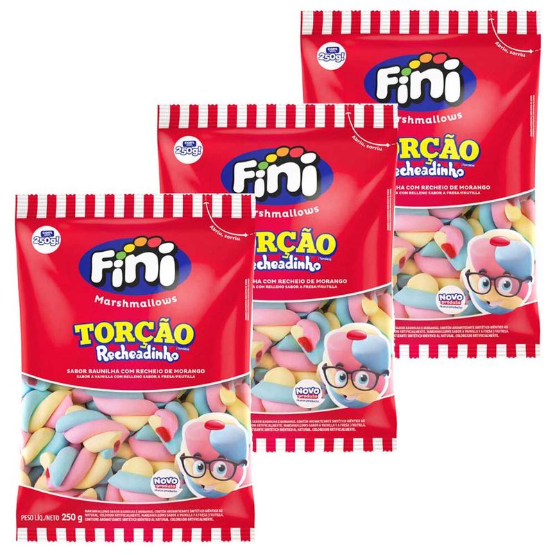 Marshmallows no formato torcido, com recheio. São deliciosos, macios, divertidos, coloridos e ricos em todos os detalhes. Opção ideal para deixar dias mais saborosos, decorar festas ou dar ainda mais beleza a pratos de confeitaria. Pacote com 250g, média de 38 unidades. Fini recheadinho. Kit contendo 3 Marshmallow recheado colorido com recheio de morango.
