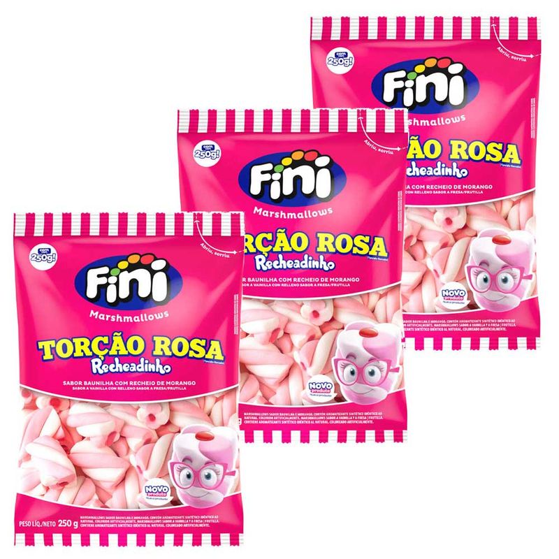 Marshmallows no formato torcido, com recheio. São deliciosos, macios, divertidos, coloridos e ricos em todos os detalhes. Opção ideal para deixar dias mais saborosos, decorar festas ou dar ainda mais beleza a pratos de confeitaria. Pacote com 250g, média de 38 unidades. Fini recheadinho. Kit contendo 3 Marshmallow recheado rosa e branco com recheio de morango.