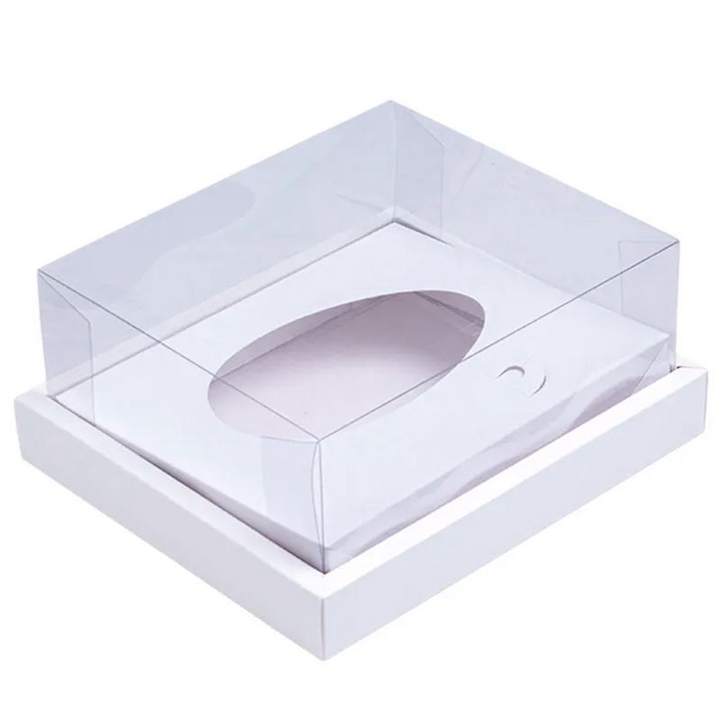 Produzida com base firme em papel cartão branco e tampa em acetato transparente, valoriza o produto e permite ótima visualização do ovo.