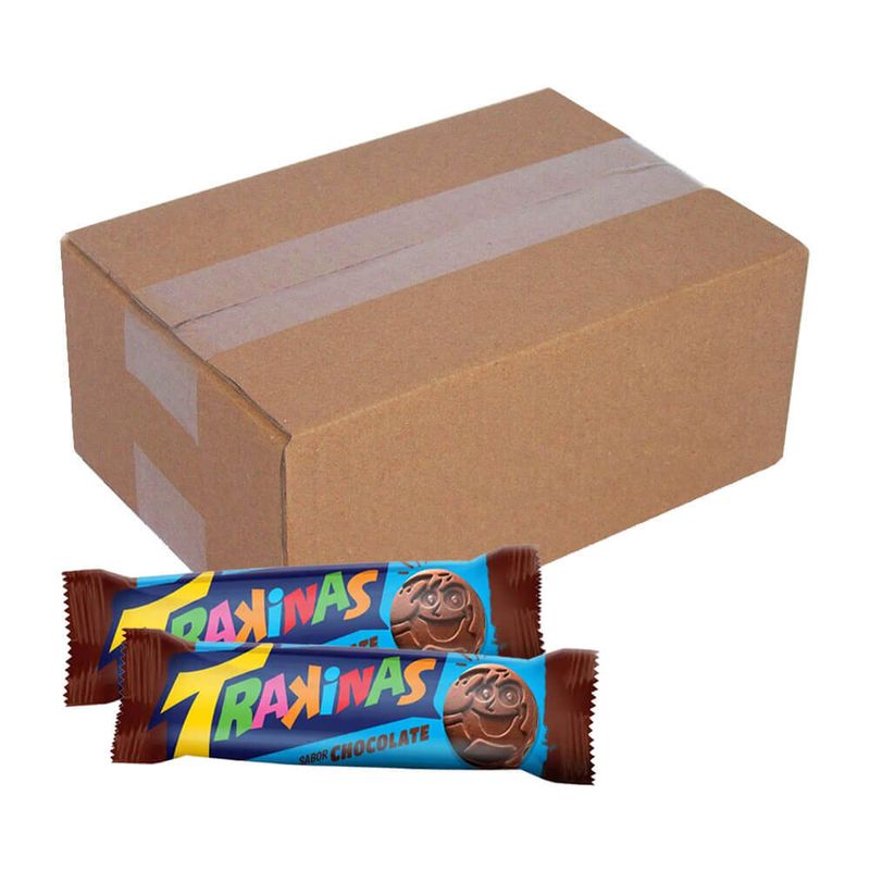 Kit contendo 24 pacotes de biscoito recheado Trakinas sabor chocolate de 126g cada.
