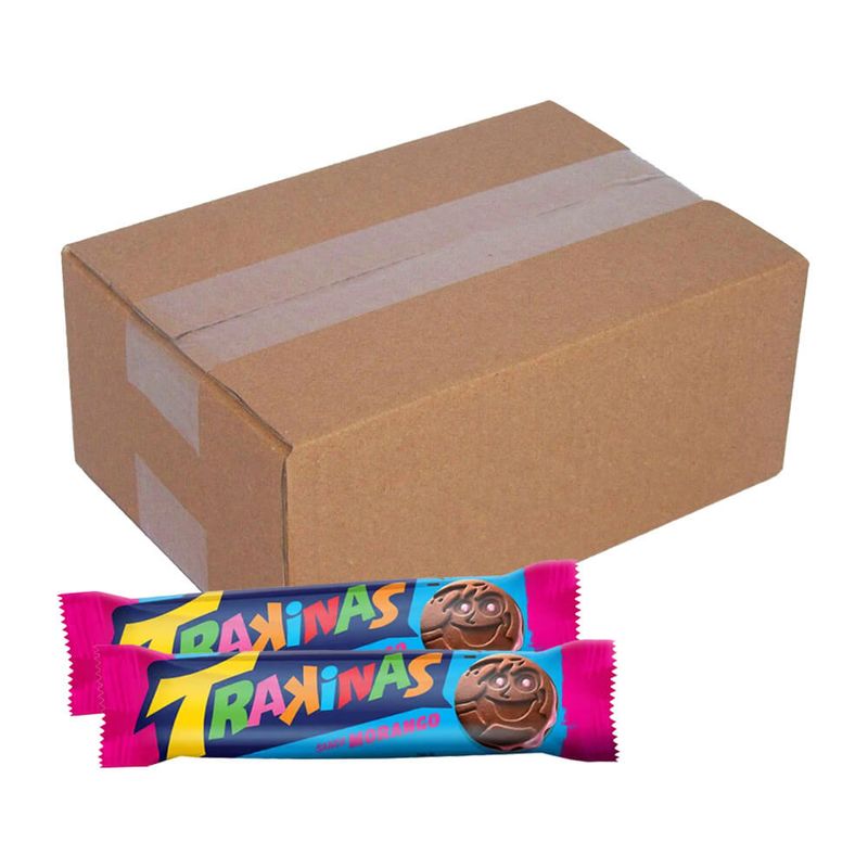 Kit contendo 24 pacotes de biscoito recheado Trakinas sabor morango de 126g cada.