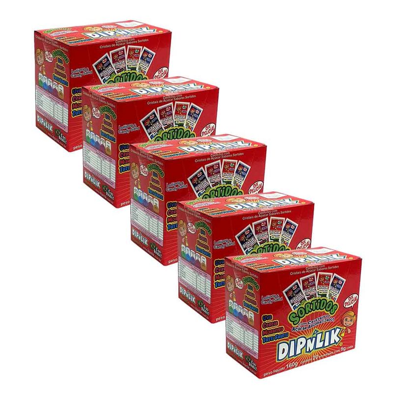 Pirulitos sortidos com cristais de açúcar aromatizados nos sabores morango, uva, laranja, tutti frutti e cereja. Kit com 5 caixas. Caixa contendo 25 envelopes de 8g cada.