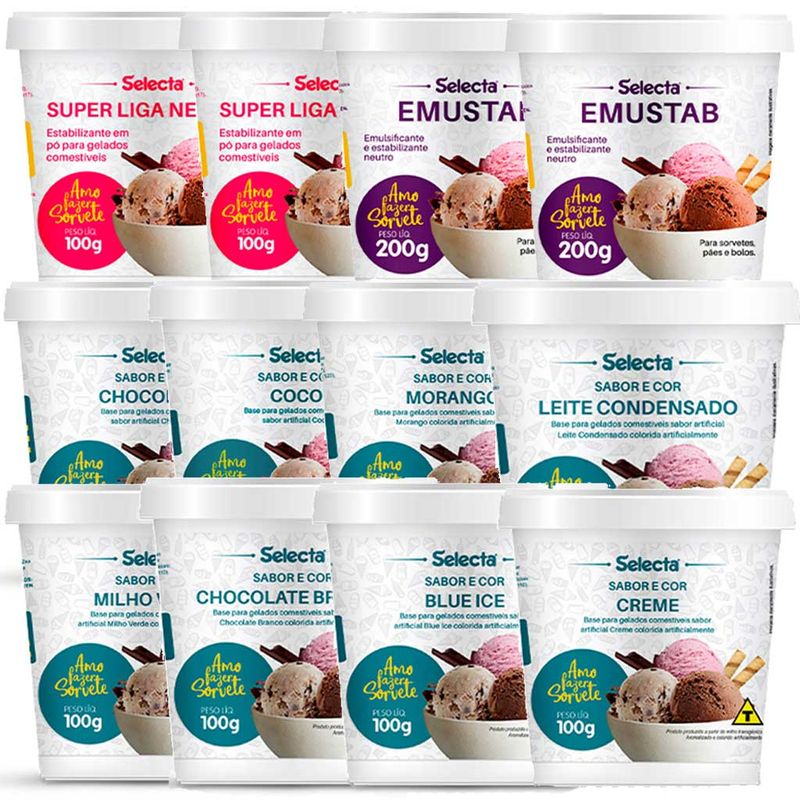Kit Faça Sorvete em Casa Escolha da Malu Sabores + Bases 12 Itens, kit com sabores em pó e bases para preparo de sorvete de massa ou picolé à base de leite.