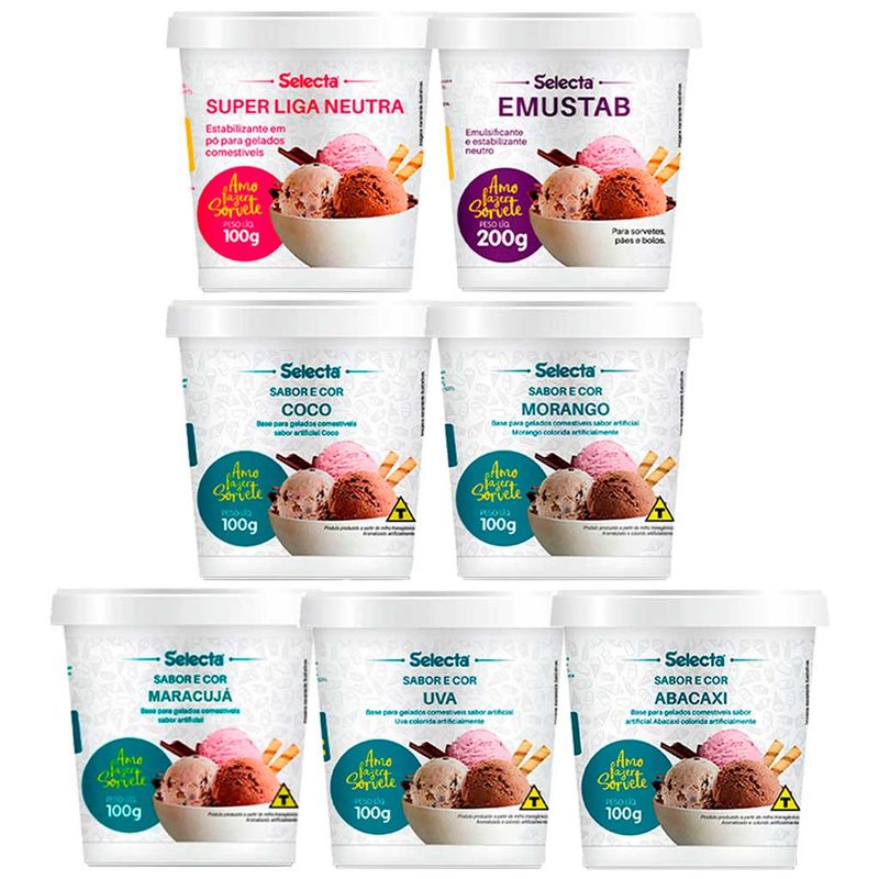 Kit Faça Sorvete em Casa Sabores de Fruta + Base + Sabor em Pó 7 Itens, kit com sabores em pó e bases para preparo de sorvete de massa ou picolé à base de leite.