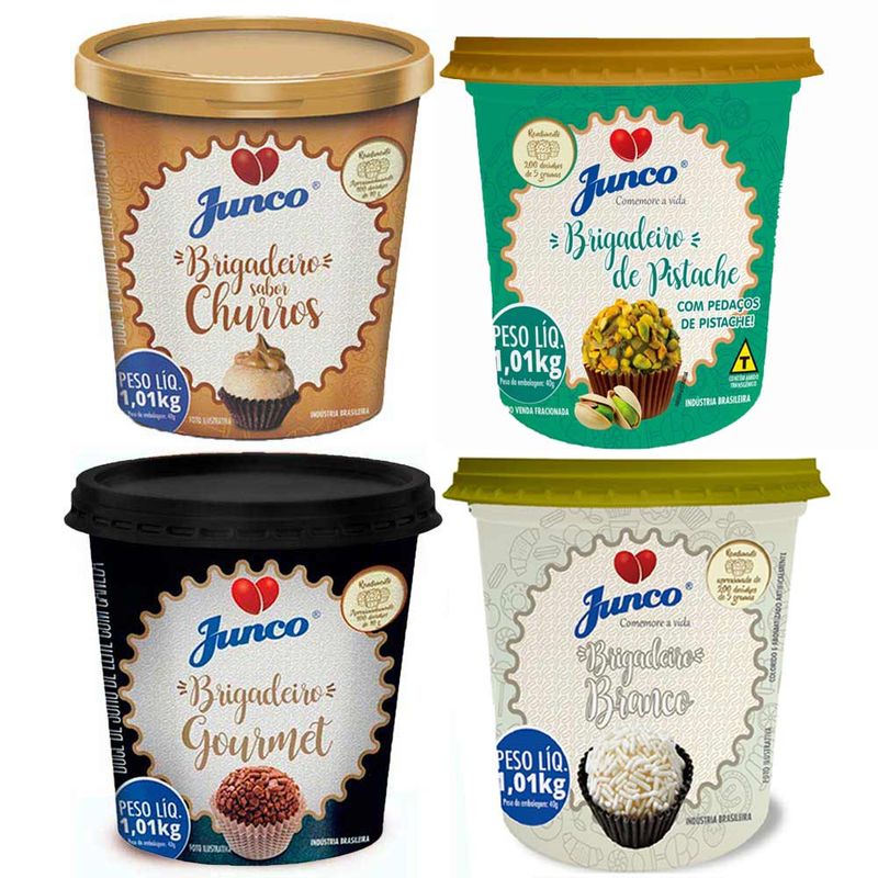 Este kit contém 4 potes de 1,010g dos seguintes sabores: Brig Gourmet, Brig Branco, Pistache e Churros. Todos os produtos JUNCO são confeccionados com matérias primas de alta qualidade, utilizando materiais adequados e tintas atóxicas no processo de impressão, observando a conformidade com todos os padrões do INMETRO. Como resultado você leva para sua casa produtos de ótima qualidade e segurança para você e sua família utilizarem à vontade.Cada pote de 1,010g tem rendimento aproximado de 200 unidades de 5g cada, que corresponde a forminha número 6. Para conservação, mantenha em local seco e arejado. Após aberto conservar no refrigerador em temperatura até 10ºC e consumir, no máximo, em 15 dias ou em temperatura ambiente até 7 dias. Ingredientes do Brig Gourmet: Soro de leite refrigerado e/ou soro de leite em pó reconstituído, leite refrigerado e/ou leite em pó integral reconstituído, açúcar, amido modificado, água, pó de cacau alcalino, chocolate em pó 50%, concentrado proteico de soro em pó, pectina (INS 440), sorbato de potássio (INS 202), aroma artificial de leite em pó e citrato de sódio (INS 331iii). Não contém glúten. Contém lactose. Alérgicos: Contém leite e derivados. Pode conter amendoim e canela. Ingredientes do Brig Branco: Soro de leite refrigerado e/ou soro de leite em pó reconstituído, açúcar, leite fluído á granel de uso industrial e/ou leite em pó integral reconstituído, amido modificado, água, concentrado proteico de soro de leite em pó, espessante pectina (INS 440), aroma idêntico ao natural de chocolate branco, conservante sorbato de potássio (INS 202), aroma idêntico ao natural de leite, estabilizante citrato de sódio (INS 331ii) e corante dióxido de titânio (INS 171). Ingredientes do Pistache: Soro de leite refrigerado e/ou soro de leite em pó reconstituído, açúcar, leite fluido a granel de uso industrial e/ou leite em pó integral reconstituído, amido modificado, água, farinha de castanha de caju, pistache triturado, pasta de pistache, concentrado proteico de soro de leite em pó, espessante pectina (INS 440), aroma idêntico ao natural de leite, aroma idêntico ao natural de pistache, conservante sorbato de potássio (INS 202), estabilizante citrato de sódio(INS 331iii) corantes de óxido de titânio (INSS 171), amarelo tartrazina (INSS 102), indigotina (INSS 132). Alérgicos: Contém leite e derivados, castanha de Caju e pistache. Pode conter amendoim e avelã. Contém lactose. Não contém glúten. Ingredientes do Churros: Soro de leite refrigerado e/ou soro de leite em pó, açúcar, leite cru refrigerado e/ou leite em pó integral, amido modificado, espessante pectina (INS 440), conservante sorbato de potássio (INS 202), canela em pó, aroma artificial de leite em pó, estabilizante citrato de sódio (INS 331iii), corante dióxido de titânio (INS 171) e corante idêntico ao natural de caramelo (INS 150c). NÃO CONTÉM GLÚTEN. Alérgicos: Contém leite e derivados. Pode conter amendoim e canela. Contém Lactose.