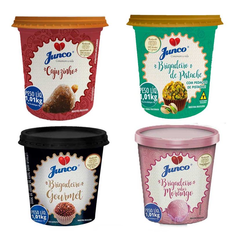 Este kit contém 4 potes de 1,010g dos seguintes sabores: Brig Gourmet, Morango, Pistache e Cajuzinho. Todos os produtos JUNCO são confeccionados com matérias primas de alta qualidade, utilizando materiais adequados e tintas atóxicas no processo de impressão, observando a conformidade com todos os padrões do INMETRO. Como resultado você leva para sua casa produtos de ótima qualidade e segurança para você e sua família utilizarem à vontade.Cada pote de 1,010g tem rendimento aproximado de 200 unidades de 5g cada, que corresponde a forminha número 6. Para conservação, mantenha em local seco e arejado. Após aberto conservar no refrigerador em temperatura até 10ºC e consumir, no máximo, em 15 dias ou em temperatura ambiente até 7 dias.