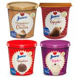 Este kit contém 4 potes de 1,010g dos seguintes sabores: Brigadeiro, Beijinho, Churros e Cajuzinho. Todos os produtos JUNCO são confeccionados com matérias primas de alta qualidade, utilizando materiais adequados e tintas atóxicas no processo de impressão, observando a conformidade com todos os padrões do INMETRO. Como resultado você leva para sua casa produtos de ótima qualidade e segurança para você e sua família utilizarem à vontade.Cada pote de 1,010g tem rendimento aproximado de 200 unidades de 5g cada, que corresponde a forminha número 6. Para conservação, mantenha em local seco e arejado. Após aberto conservar no refrigerador em temperatura até 10ºC e consumir, no máximo, em 15 dias ou em temperatura ambiente até 7 dias. Ingredientes do Brigadeiro: Soro de leite refrigerado e/ou soro de leite em pó reconstituído, açúcar, amido, leite cru refrigerado e ou leite em pó integral reconstituído, pó de cacau alcalino, concentrado proteico de soro em pó, espessante pectina (INS 440), conservante sorbato de potássio (INS 202), aroma artificial de leite em pó, estabilizante citrato de sódio (INS 331iii) e aroma artificial de baunilha. Não contém glúten. Contém lactose. Alérgicos: Contém leite e derivados. Pode conter amendoim e canela. Ingredientes do Beijinho: Soro de leite refrigerado e/ou soro de leite em pó reconstituído, açúcar, amido modificado, coco ralado, leite cru refrigerado e ou leite em pó integral reconstituído, concentrado proteico de soro em pó, espessante pectina (INS 440), conservante sorbato de potássio (INS 202), corante dióxido de titânio (INS 171), estabilizante citrato de sódio (INS 331iii) e aroma artificial de leite em pó. Não contém glúten. Contém lactose. Alérgicos: Contém leite e derivados. Pode conter amendoim e canela. Ingredientes do Churros: Soro de leite refrigerado e/ou soro de leite em pó, açúcar, leite cru refrigerado e/ou leite em pó integral, amido modificado, espessante pectina (INS 440), conservante sorbato de potássio (INS 202), canela em pó, aroma artificial de leite em pó, estabilizante citrato de sódio (INS 331iii), corante dióxido de titânio (INS 171) e corante idêntico ao natural de caramelo (INS 150c). NÃO CONTÉM GLÚTEN. Alérgicos: Contém leite e derivados. Pode conter amendoim e canela. Contém Lactose. Ingredientes do Cajuzinho: Soro de leite refrigerado e/ou soro de leite em pó, açúcar, leite cru integral e ou leite em pó integral, amido modificado, farinha de amendoim, espessante pectina (INS 440), pó de cacau alcalino, conservante sorbato de potássio (INS 202), aroma artificial de leite em pó e estabilizante citrato de sódio (INS 331iii). Não contém glúten. Contém lactose. Alérgicos: Contém leite e derivados. Pode conter amendoim e canela.