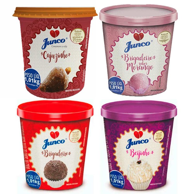 Este kit contém 4 potes de 1,010g dos seguintes sabores: Brigadeiro, Beijinho, Morango e Cajuzinho. Todos os produtos JUNCO são confeccionados com matérias primas de alta qualidade, utilizando materiais adequados e tintas atóxicas no processo de impressão, observando a conformidade com todos os padrões do INMETRO. Como resultado você leva para sua casa produtos de ótima qualidade e segurança para você e sua família utilizarem à vontade.Cada pote de 1,010g tem rendimento aproximado de 200 unidades de 5g cada, que corresponde a forminha número 6. Para conservação, mantenha em local seco e arejado. Após aberto conservar no refrigerador em temperatura até 10ºC e consumir, no máximo, em 15 dias ou em temperatura ambiente até 7 dias. Ingredientes do Brigadeiro: Soro de leite refrigerado e/ou soro de leite em pó reconstituído, açúcar, amido, leite cru refrigerado e ou leite em pó integral reconstituído, pó de cacau alcalino, concentrado proteico de soro em pó, espessante pectina (INS 440), conservante sorbato de potássio (INS 202), aroma artificial de leite em pó, estabilizante citrato de sódio (INS 331iii) e aroma artificial de baunilha. Não contém glúten. Contém lactose. Alérgicos: Contém leite e derivados. Pode conter amendoim e canela. Ingredientes do Beijinho: Soro de leite refrigerado e/ou soro de leite em pó reconstituído, açúcar, amido modificado, coco ralado, leite cru refrigerado e ou leite em pó integral reconstituído, concentrado proteico de soro em pó, espessante pectina (INS 440), conservante sorbato de potássio (INS 202), corante dióxido de titânio (INS 171), estabilizante citrato de sódio (INS 331iii) e aroma artificial de leite em pó. Não contém glúten. Contém lactose. Alérgicos: Contém leite e derivados. Pode conter amendoim e canela. Ingredientes do Morango: Soro de leite refrigerado e/ou soro de leite em pó, açúcar, leite cru refrigerado e ou leite em pó integral, amido modificado, espessante pectina (INS 440), aroma idêntico ao natural de morango, conservante sorbato de potássio (INS 202), aroma artificial de leite em pó, estabilizante citrato de sódio (INS 331iii), corante dióxido de titânio (INS 171) e mistura de corantes artificiais para fins alimentícios rosa brilhante (glicose, açúcar e corantes artificiais: amaranto (INS 123) (25%), ponceau 4R (INS 124) (23,5%) e amarelo crepúsculo (INS 110) (1,85%). Ingredientes do Cajuzinho: Soro de leite refrigerado e/ou soro de leite em pó, açúcar, leite cru integral e ou leite em pó integral, amido modificado, farinha de amendoim, espessante pectina (INS 440), pó de cacau alcalino, conservante sorbato de potássio (INS 202), aroma artificial de leite em pó e estabilizante citrato de sódio (INS 331iii). Não contém glúten. Contém lactose. Alérgicos: Contém leite e derivados. Pode conter amendoim e canela.