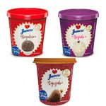 Este kit contém 3 potes de 1,010g dos seguintes sabores: Brigadeiro, Beijinho e Cajuzinho. Todos os produtos JUNCO são confeccionados com matérias primas de alta qualidade, utilizando materiais adequados e tintas atóxicas no processo de impressão, observando a conformidade com todos os padrões do INMETRO. Como resultado você leva para sua casa produtos de ótima qualidade e segurança para você e sua família utilizarem à vontade.Cada pote de 1,010g tem rendimento aproximado de 200 unidades de 5g cada, que corresponde a forminha número 6. Para conservação, mantenha em local seco e arejado. Após aberto conservar no refrigerador em temperatura até 10ºC e consumir, no máximo, em 15 dias ou em temperatura ambiente até 7 dias. Ingredientes do Brigadeiro: Soro de leite refrigerado e/ou soro de leite em pó reconstituído, açúcar, amido, leite cru refrigerado e ou leite em pó integral reconstituído, pó de cacau alcalino, concentrado proteico de soro em pó, espessante pectina (INS 440), conservante sorbato de potássio (INS 202), aroma artificial de leite em pó, estabilizante citrato de sódio (INS 331iii) e aroma artificial de baunilha. Não contém glúten. Contém lactose. Alérgicos: Contém leite e derivados. Pode conter amendoim e canela. Ingredientes do Beijinho: Soro de leite refrigerado e/ou soro de leite em pó reconstituído, açúcar, amido modificado, coco ralado, leite cru refrigerado e ou leite em pó integral reconstituído, concentrado proteico de soro em pó, espessante pectina (INS 440), conservante sorbato de potássio (INS 202), corante dióxido de titânio (INS 171), estabilizante citrato de sódio (INS 331iii) e aroma artificial de leite em pó. Não contém glúten. Contém lactose. Alérgicos: Contém leite e derivados. Pode conter amendoim e canela. Ingredientes do Cajuzinho: Soro de leite refrigerado e/ou soro de leite em pó, açúcar, leite cru integral e ou leite em pó integral, amido modificado, farinha de amendoim, espessante pectina (INS 440), pó de cacau alcalino, conservante sorbato de potássio (INS 202), aroma artificial de leite em pó e estabilizante citrato de sódio (INS 331iii). Não contém glúten. Contém lactose. Alérgicos: Contém leite e derivados. Pode conter amendoim e canela.