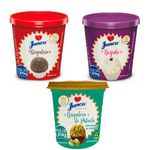 Este kit contém 3 potes de 1,010g dos seguintes sabores: Brigadeiro, Beijinho e Pistache. Todos os produtos JUNCO são confeccionados com matérias primas de alta qualidade, utilizando materiais adequados e tintas atóxicas no processo de impressão, observando a conformidade com todos os padrões do INMETRO. Como resultado você leva para sua casa produtos de ótima qualidade e segurança para você e sua família utilizarem à vontade.Cada pote de 1,010g tem rendimento aproximado de 200 unidades de 5g cada, que corresponde a forminha número 6. Para conservação, mantenha em local seco e arejado. Após aberto conservar no refrigerador em temperatura até 10ºC e consumir, no máximo, em 15 dias ou em temperatura ambiente até 7 dias. Ingredientes do Brigadeiro: Soro de leite refrigerado e/ou soro de leite em pó reconstituído, açúcar, amido, leite cru refrigerado e ou leite em pó integral reconstituído, pó de cacau alcalino, concentrado proteico de soro em pó, espessante pectina (INS 440), conservante sorbato de potássio (INS 202), aroma artificial de leite em pó, estabilizante citrato de sódio (INS 331iii) e aroma artificial de baunilha. Não contém glúten. Contém lactose. Alérgicos: Contém leite e derivados. Pode conter amendoim e canela. Ingredientes do Beijinho: Soro de leite refrigerado e/ou soro de leite em pó reconstituído, açúcar, amido modificado, coco ralado, leite cru refrigerado e ou leite em pó integral reconstituído, concentrado proteico de soro em pó, espessante pectina (INS 440), conservante sorbato de potássio (INS 202), corante dióxido de titânio (INS 171), estabilizante citrato de sódio (INS 331iii) e aroma artificial de leite em pó. Não contém glúten. Contém lactose. Alérgicos: Contém leite e derivados. Pode conter amendoim e canela. Ingredientes do Pistache: Soro de leite refrigerado e/ou soro de leite em pó reconstituído, açúcar, leite fluido a granel de uso industrial e/ou leite em pó integral reconstituído, amido modificado, água, farinha de castanha de caju, pistache triturado, pasta de pistache, concentrado proteico de soro de leite em pó, espessante pectina (INS 440), aroma idêntico ao natural de leite, aroma idêntico ao natural de pistache, conservante sorbato de potássio (INS 202), estabilizante citrato de sódio(INS 331iii) corantes de óxido de titânio (INSS 171), amarelo tartrazina (INSS 102), indigotina (INSS 132). Alérgicos: Contém leite e derivados, castanha de Caju e pistache. Pode conter amendoim e avelã. Contém lactose. Não contém glúten.