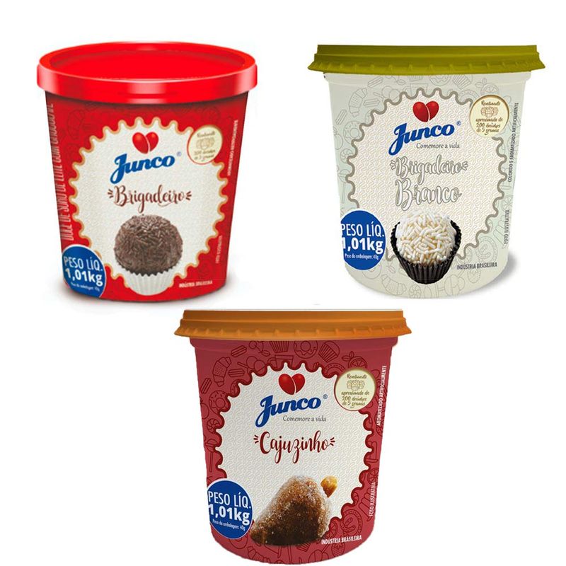 Este kit contém 3 potes de 1,010g dos seguintes sabores: Brigadeiro, Brig Branco e Cajuzinho. Todos os produtos JUNCO são confeccionados com matérias primas de alta qualidade, utilizando materiais adequados e tintas atóxicas no processo de impressão, observando a conformidade com todos os padrões do INMETRO. Como resultado você leva para sua casa produtos de ótima qualidade e segurança para você e sua família utilizarem à vontade.Cada pote de 1,010g tem rendimento aproximado de 200 unidades de 5g cada, que corresponde a forminha número 6. Para conservação, mantenha em local seco e arejado. Após aberto conservar no refrigerador em temperatura até 10ºC e consumir, no máximo, em 15 dias ou em temperatura ambiente até 7 dias. Ingredientes do Brigadeiro: Soro de leite refrigerado e/ou soro de leite em pó reconstituído, açúcar, amido, leite cru refrigerado e ou leite em pó integral reconstituído, pó de cacau alcalino, concentrado proteico de soro em pó, espessante pectina (INS 440), conservante sorbato de potássio (INS 202), aroma artificial de leite em pó, estabilizante citrato de sódio (INS 331iii) e aroma artificial de baunilha. Não contém glúten. Contém lactose. Alérgicos: Contém leite e derivados. Pode conter amendoim e canela. Ingredientes do Brig Branco: Soro de leite refrigerado e/ou soro de leite em pó reconstituído, açúcar, leite fluído á granel de uso industrial e/ou leite em pó integral reconstituído, amido modificado, água, concentrado proteico de soro de leite em pó, espessante pectina (INS 440), aroma idêntico ao natural de chocolate branco, conservante sorbato de potássio (INS 202), aroma idêntico ao natural de leite, estabilizante citrato de sódio (INS 331ii) e corante dióxido de titânio (INS 171). Ingredientes do Cajuzinho: Soro de leite refrigerado e/ou soro de leite em pó, açúcar, leite cru integral e ou leite em pó integral, amido modificado, farinha de amendoim, espessante pectina (INS 440), pó de cacau alcalino, conservante sorbato de potássio (INS 202), aroma artificial de leite em pó e estabilizante citrato de sódio (INS 331iii). Não contém glúten. Contém lactose. Alérgicos: Contém leite e derivados. Pode conter amendoim e canela.